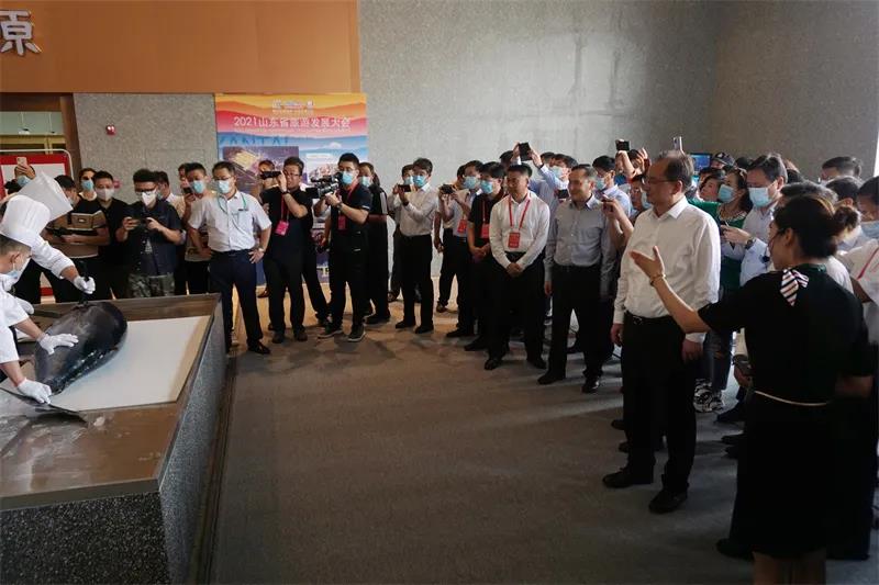 “咣!上魚(yú)嘍!”伴隨一聲嘹亮的吆喝,六人抬著一條200斤重的的金槍魚(yú),送到展示廳廚師面前現(xiàn)場(chǎng)開(kāi)魚(yú),作為隆重又極具特色的海洋民俗文化,碩大的金槍魚(yú)在主刀廚師手里,僅僅幾分鐘就被去頭去尾,剔骨剝?nèi)?現(xiàn)場(chǎng)觀眾不禁叫絕。9月23日下午,2021山東省旅游發(fā)展大會(huì)參會(huì)代表一行來(lái)到芝罘灣商旅綜合體觀摩考察,打卡煙臺(tái)生態(tài)漁市文化新地標(biāo),體驗(yàn)商旅融合多元休閑新場(chǎng)景。