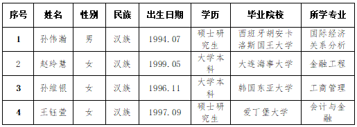 按照集團10月11日發(fā)布的招聘公告,經(jīng)過簡歷投遞、資格審查、筆試、面試、背景調(diào)查、集體決策等環(huán)節(jié),確定擬錄用人員,現(xiàn)予以公示,公示期為5個工作日(12月6日至12月10日)。公示期間如有異議,請與煙臺市財金發(fā)展投資集團有限公司聯(lián)系,電話:0535-6887160。